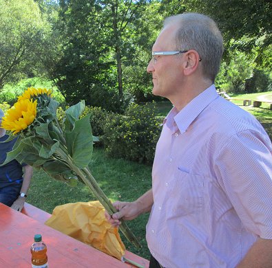 Frey und Dekan Ralf Drescher (rechts), der mit Sonnenblumen seinen Dank für